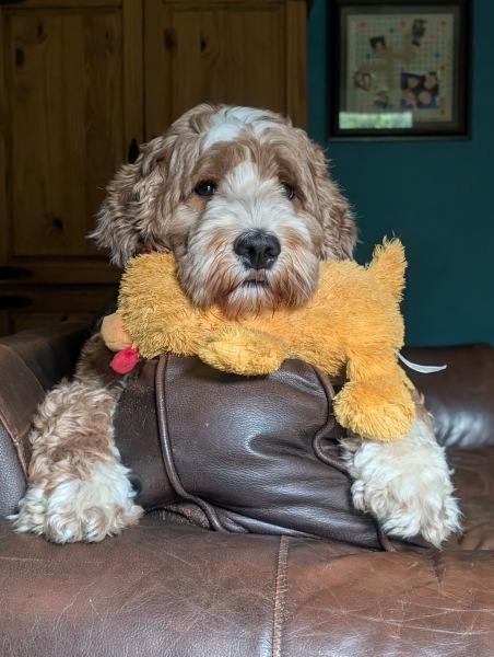 We knew Harper wanted to be a mom within a month of her joining our family. From the day our other momma dog’s puppies were old enough to meet Auntie Harper, she wanted nothing more than to play with them, bathe them, and even watch over them adoringly while they slept. When there are no puppies around on the other hand, Harper carries her stuffed friends with her everywhere as if they were her babies, we always tell our guests they must be special if she brings them one of her friends. Harper loves to play. From fetching a ball, to getting zoomies on our trampoline, she is a silly girl with a big personality and an even bigger heart, we love our Harpy girl!