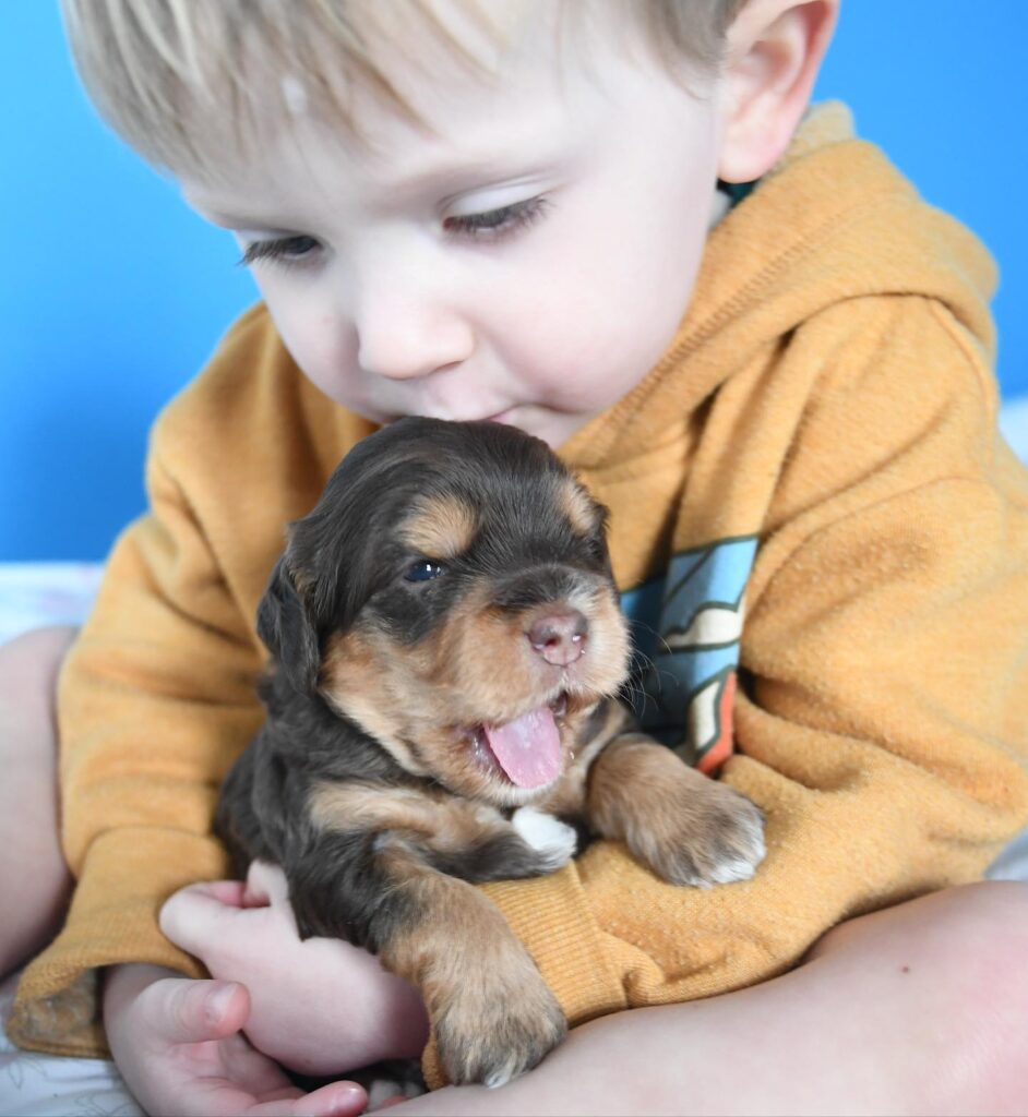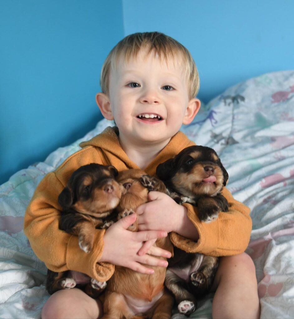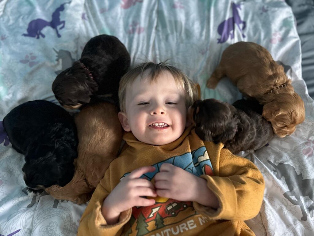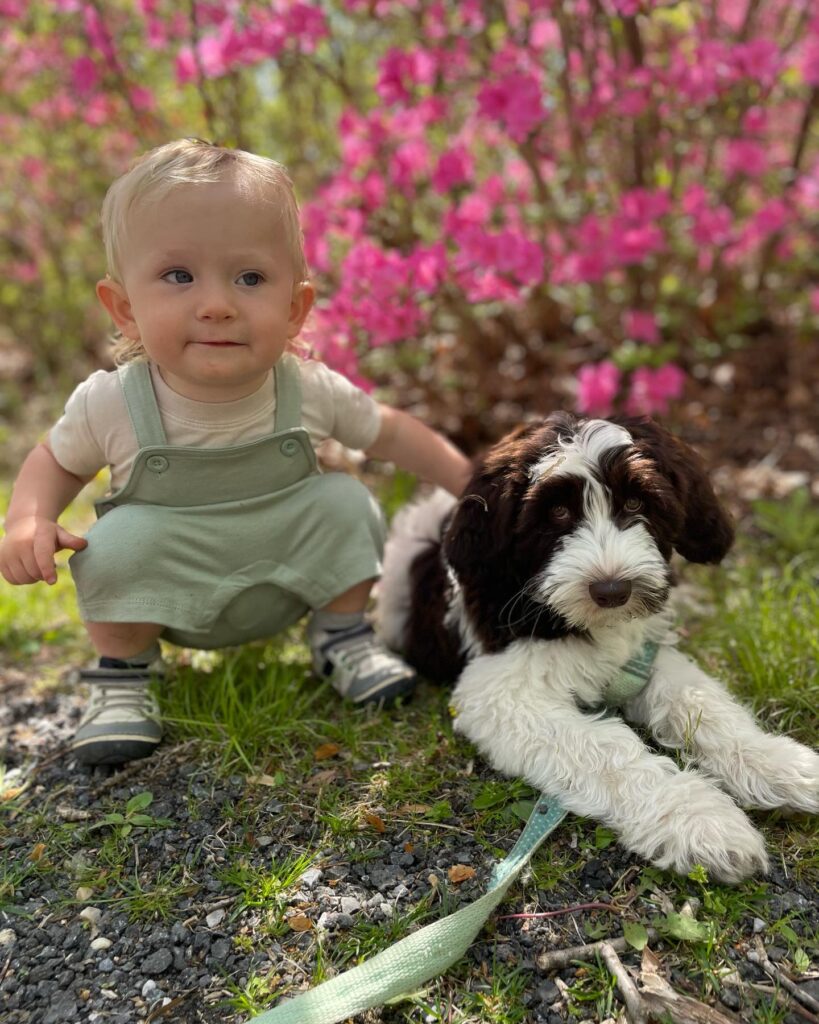 Hello! We are Julia and Nick, and together with our three young boys (Nicky, Jack, and Davey) we make up Eden Valley. We currently juggle the life of raising our three wild boys and puppies all at once! I grew up breeding labradoodles along side my mom, Pam, who started Eden Valley about 20 years ago. Nick and I have both always been avid dog lovers, Nick growing up with a springer spaniel Jude who was his baby. Our family is high energy, chaotic at times, and full of love! Honey and Bailey are our two dogs that live with us and complete our family, and there is nothing we would love more than to raise the perfect puppy to complete yours as well.